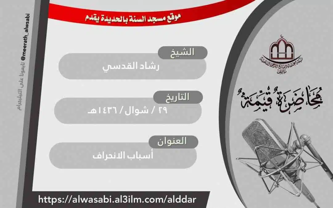 محاضرة للشيخ رشاد القدسي – بعنوان: أسباب الانحراف الجمعة ۱۰ ذو الحجة ۱٤۳۸ هـ الموافق ۱ سبتمبر ۲۰۱۷ مـ | المحاضرات، غير مصنف | شارك بتعليقك PlayStop نافذة X مقالات ذات صلة محاضرة للشيخ عبدالله بن علي هبه - بعنوان: الاعتصام بحبل الله والتحذير من التفرقة محاضرة للشيخ أبي مالك يحيى المنصوري - بعنوان: الرزق اترك ردإلغاء الرد
